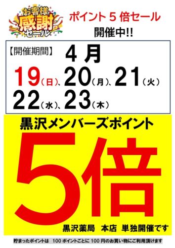 鴻巣奉仕会 2026.04.18 黒沢薬局 本店 ポイント5倍セール開催! いつもご利用ありがとうございます。黒沢薬局 本店にて 黒沢カード ポイント5倍セールを開催致します。 とってもお得な5日間ですので、ぜひご利用下さいませ! Post Share Hatena LINE RSS feedly Pin it note 黒沢薬局 本店「病気の9割は弱木から!」 前の記事