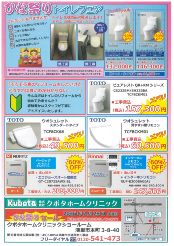 2026年2月28日(土)クボタホームクリニックショールームにて「ひな祭りセール」快適ラク家事フェア・ひな祭りトイレフェアを開催します。お得な企画が盛りだくさん、皆様のお越しをお待ちしております。