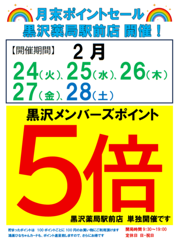 黒沢薬局 駅前店 限定、月末ポイントセール開催‼