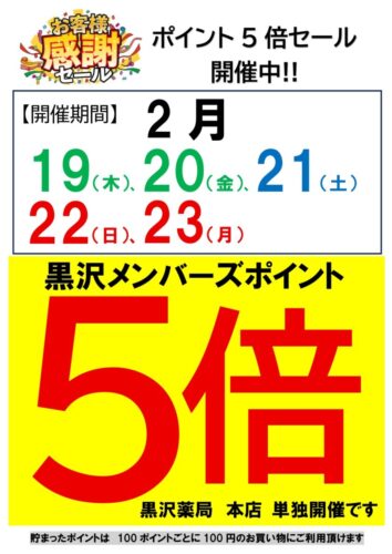 黒沢薬局 本店 2026.02.18 黒沢薬局 本店 ポイント5倍セールのお知らせ 黒沢薬局 本店 ポイント5倍セール開催中! 2/19(木)~2/23(月) 5日間限定です! 大変お得なイベントです! 黒沢ポイントの新規ご入会も大歓迎です!無料で即日発行致します。 さらに!ひなちゃんポイントも進呈! ぜひ黒沢薬局 本店へご来店下さいませ! Post Share Hatena LINE RSS feedly Pin it note 快適ラク家事フェア・ひな祭りトイレフェアを開催! 前の記事 黒沢薬局駅前店 黒沢メンバーズポイント5倍セール開催! 次の記事